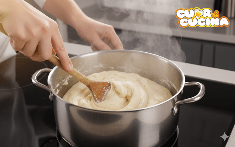Energia ai Fornelli: Mescola con vigore usando un cucchiaio di legno. Mantieni la fiamma vivace e lavora l'impasto con forza: il calore deve cuocere uniformemente la farina mentre crei un composto liscio.