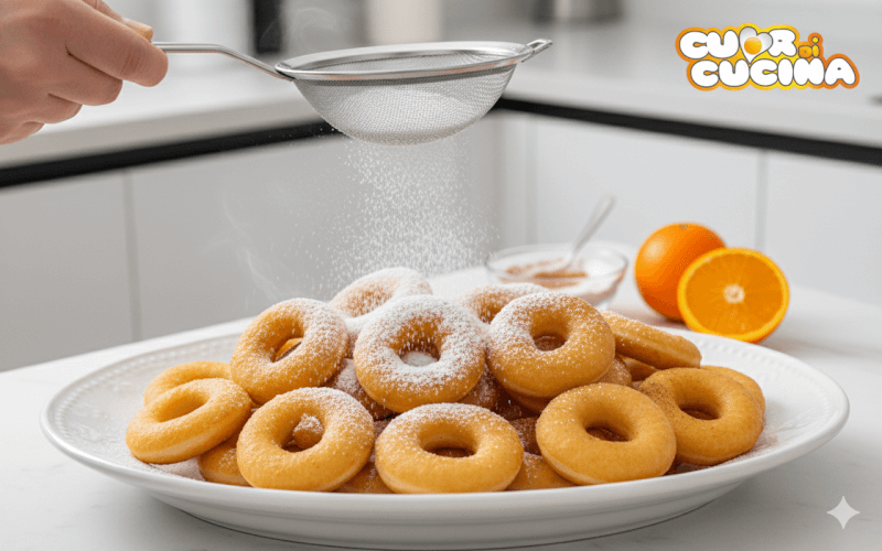 La Spolverata Finale: Disponi le frittelle su un vassoio e usa lo spargizucchero per ricoprirle con un mix setoso di zucchero a velo e cannella. La cannella è il tocco finale che esalta il liquore al mandarino.