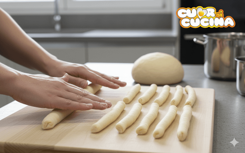Creazione dei Tubolari: Dividi il panetto in pezzi più piccoli e, con il palmo delle mani, forma dei cordoncini o striscioline tubolari di spessore uniforme.