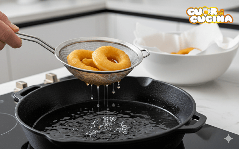 Sgocciolatura Perfetta: Usa un "ragno" da cucina per sollevare le cuddureddi. Lascia che l'olio in eccesso scivoli via: il segreto di un buon fritto è l'asciuttezza