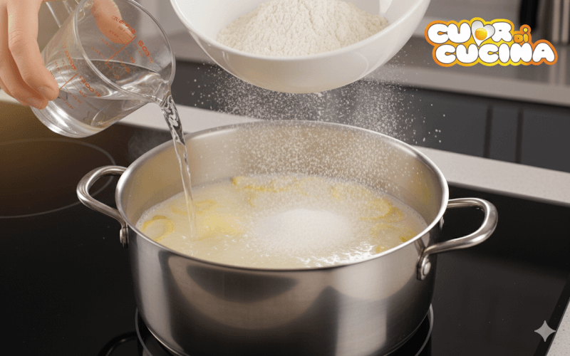 L'Aggiunta a Pioggia: Versa il mezzo bicchiere di acqua fredda per stabilizzare la temperatura, poi aggiungi le due farine (00 e semola) a pioggia. È un momento magico dove i liquidi iniziano a dar vita alla struttura del dolce.