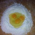 Iniziate a lavorare con l’aiuto di una forchetta le uova, man mano tiratevi la farina dentro l’incavo, fino ad ottenere un impasto lavorabile con le mani. Lavorate a lungo la pasta fino a che risulterà un po’ duretta (se risultasse troppo dura aggiungete un paio di cucchiai di acqua calda).